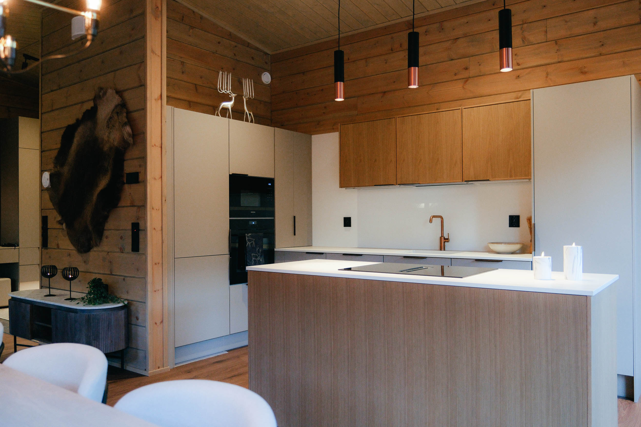 The villa has three bedrooms with premium beds that ensure the utmost comfort. All rooms are decorated in soothing colors and equipped with blackout curtains for a restful night’s sleep. The suite has a private bathroom and a view of Johanneskallio. The master bedroom features its own desk, ideal for remote work.