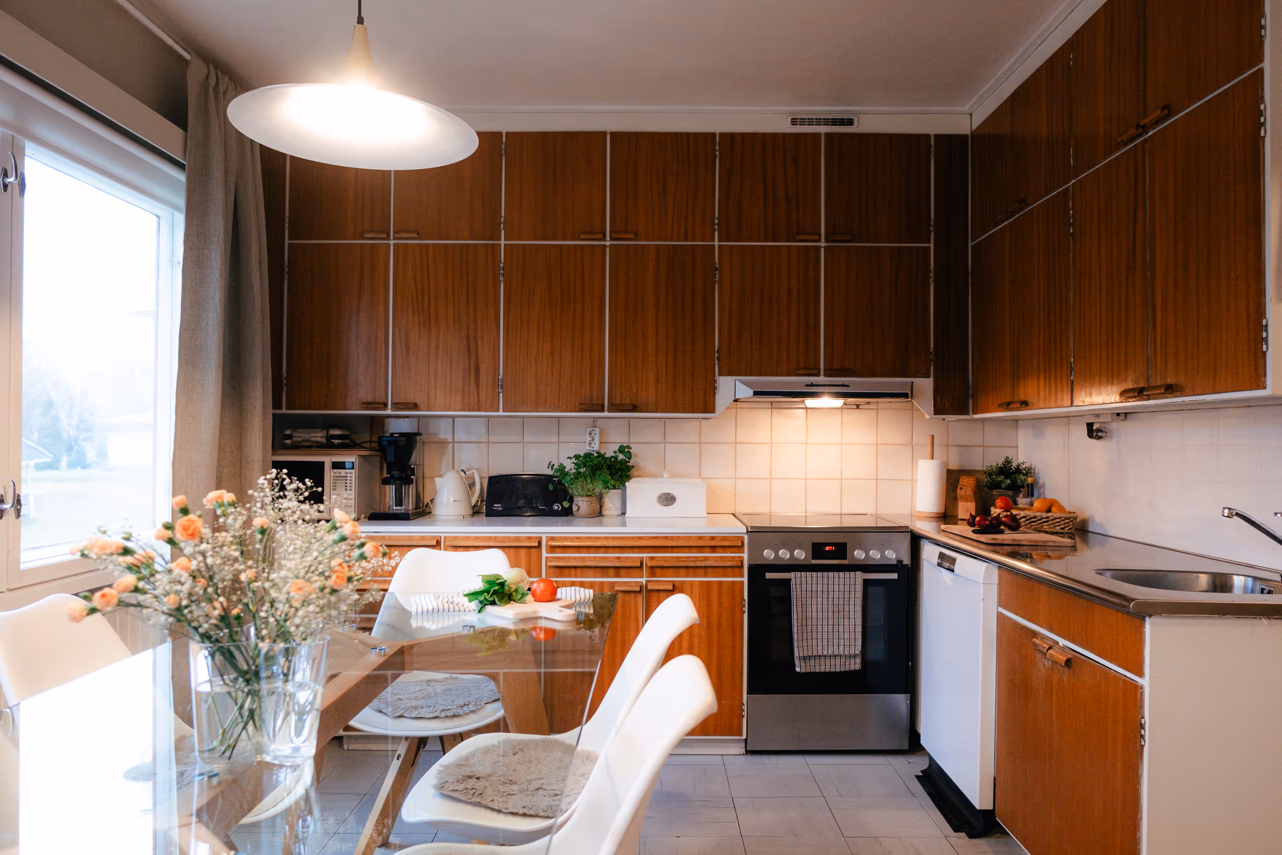 Smakfull retroinredning med stora fönster mot den gamla äppelträdgården och den vackra ån. Öppna ytor med parkettgolv och teaktrappa. Fullt utrustat kök och en genuin varm hemkänsla.